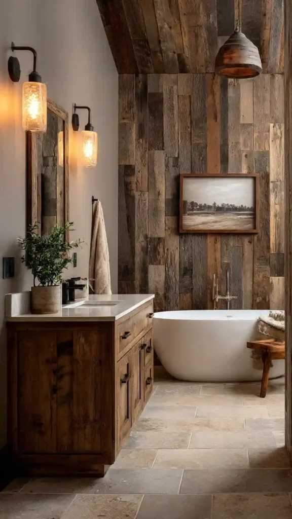 2. Rustic Farmhouse Bathroom with Reclaimed Wood Vanity