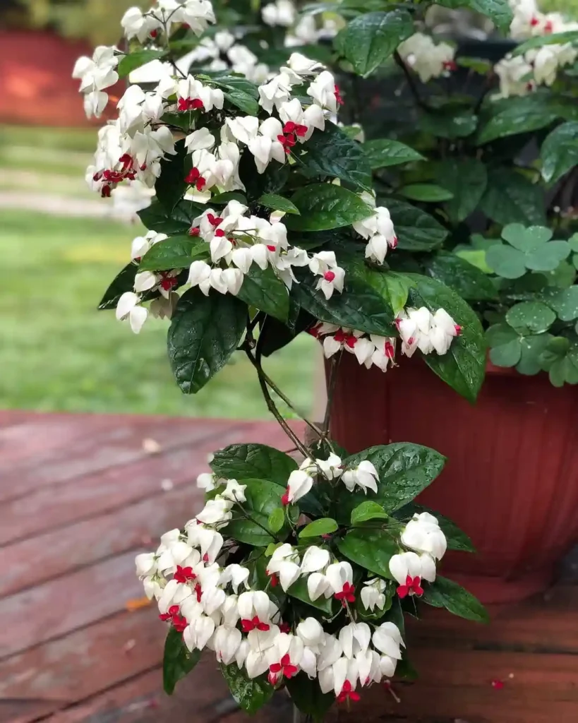 The Bleeding Heart Vine is a stunning subtropical climber known for its unique, bi-color flowers: a snowy-white, heart-shaped outer shell with a bright red petal peeking through the center. It is a well-behaved twining vine that doesn’t become overly aggressive, making it one of the best flowering options for medium-sized pots on porches or entryways.