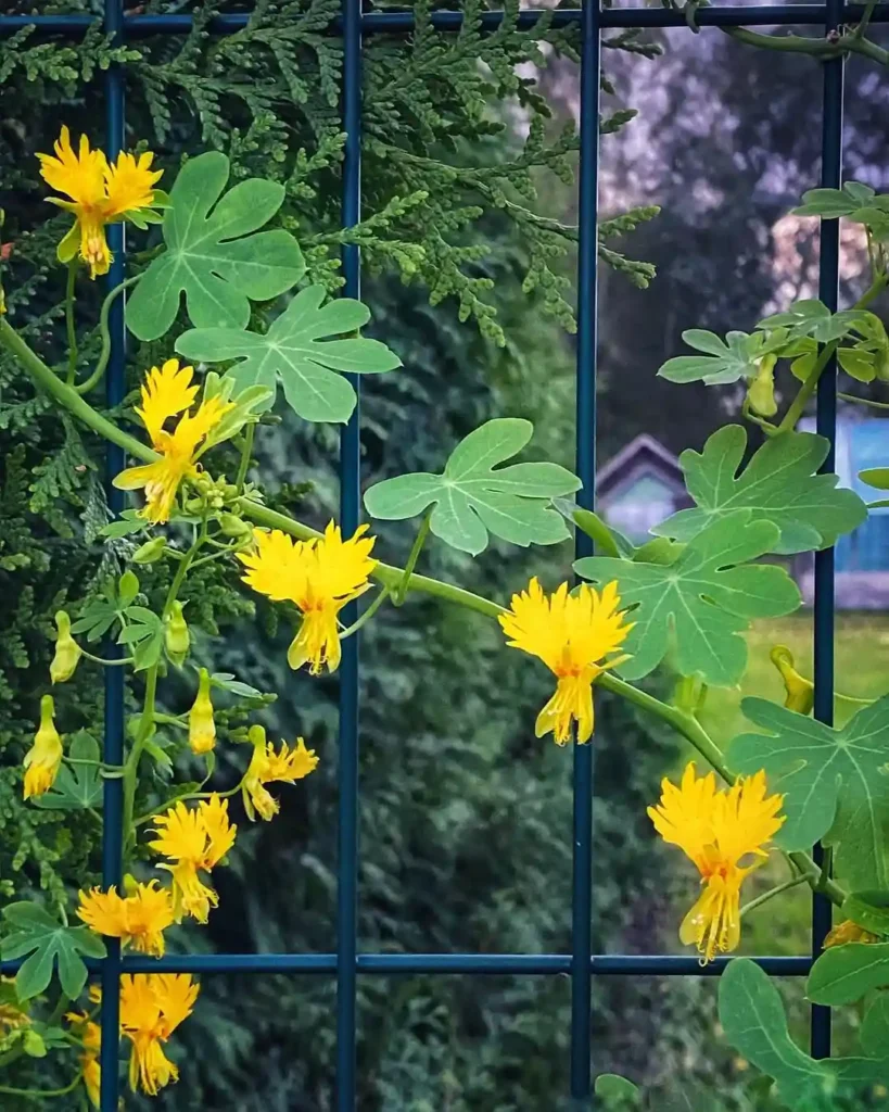The Canary Creeper is a delicate-looking but fast-growing relative of the Nasturtium. It produces fringed, bright yellow flowers that look like tiny canary wings. Because the vine is lightweight and uses fine tendrils, it is perfect for growing over more delicate shrubs or smaller trellises without weighing them down. It prefers cooler temperatures and adds a light, airy feel to the garden.