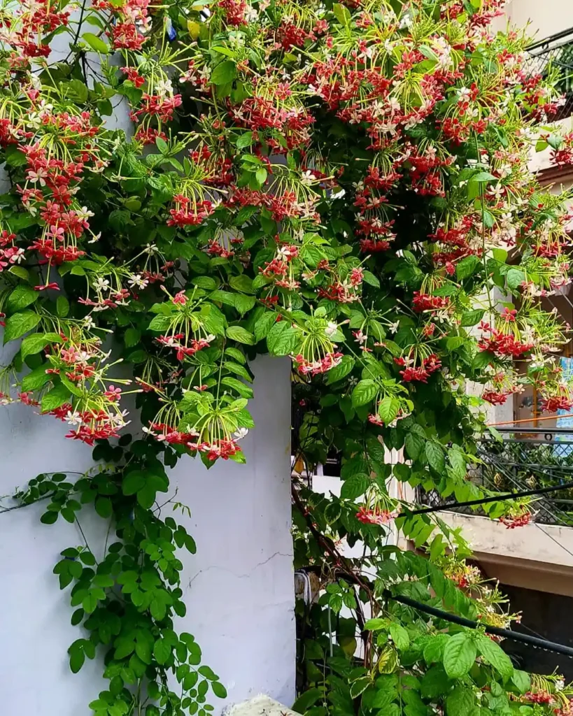A favorite in warm, tropical climates, the Rangoon Creeper is a vigorous woody vine known for its color-changing flowers. The blossoms open white, turn pink, and eventually age to a deep red, often showing all three colors at once. It is a fragrant, fast-grower that thrives in heat and can quickly create a thick canopy over a pergola or porch.