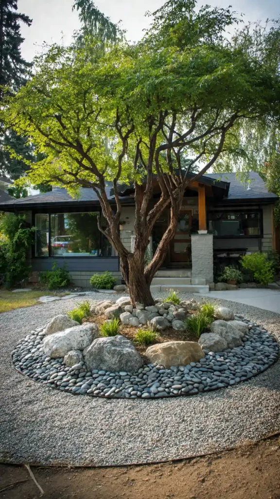 This design turns a simple tree into a real focal point. Instead of leaving it surrounded by plain grass, the circular gravel and rock border creates a clean, defined zone. The mix of large stones and small pebbles adds texture, while the open space around it keeps the yard feeling uncluttered.