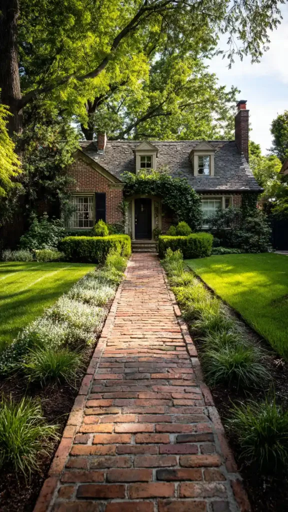 This one feels straight out of a storybook. The brick walkway naturally draws you toward the front door, while the soft greenery on both sides keeps it from feeling too rigid. The trimmed hedges near the entrance add structure, while the slightly wild edges give it charm.