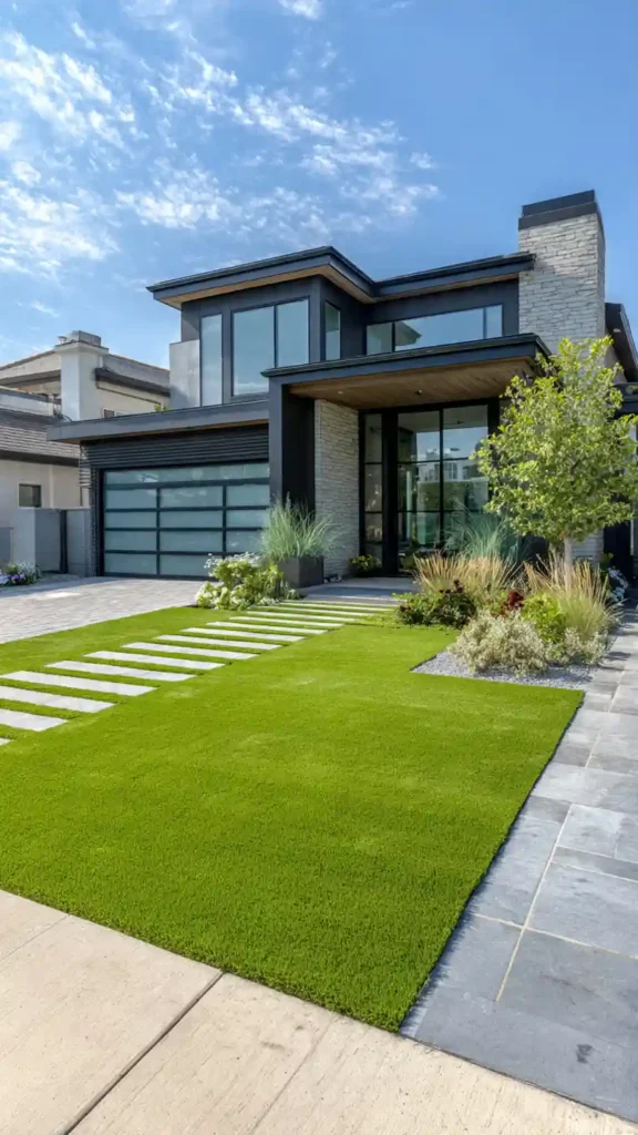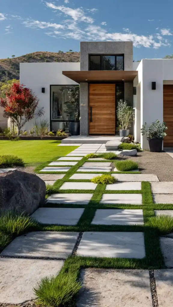 This layout is very modern and visually striking. The grid pattern made with concrete slabs and grass lines creates a clean geometric look that feels high-end. It’s structured, but the grass softens it just enough to keep it from feeling too harsh.