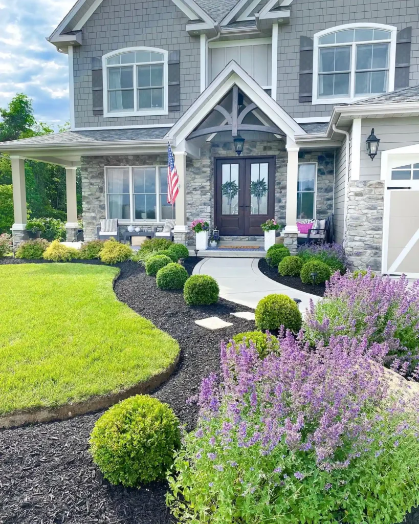 This design feels smooth and natural. The curved walkway gently leads to the front door, while the round shrubs and purple flowers soften the edges. The mix of textures—grass, mulch, and plants—keeps it visually interesting without being busy.