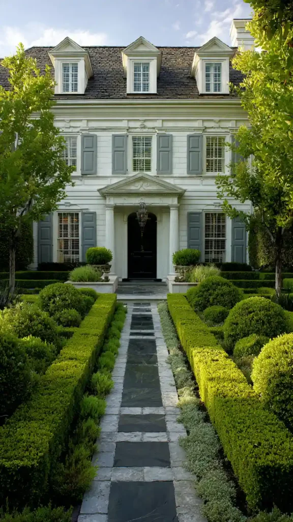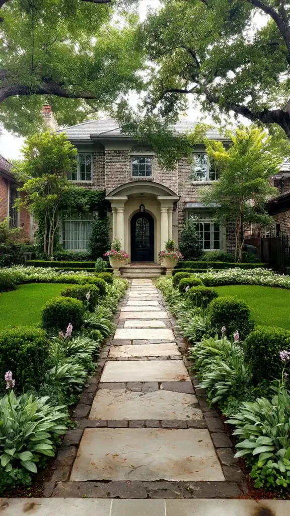 This one is all about balance and elegance. The straight pathway, trimmed hedges, and matching plant layout create a very polished look. Everything feels aligned and intentional, which gives that classic, high-end curb appeal.