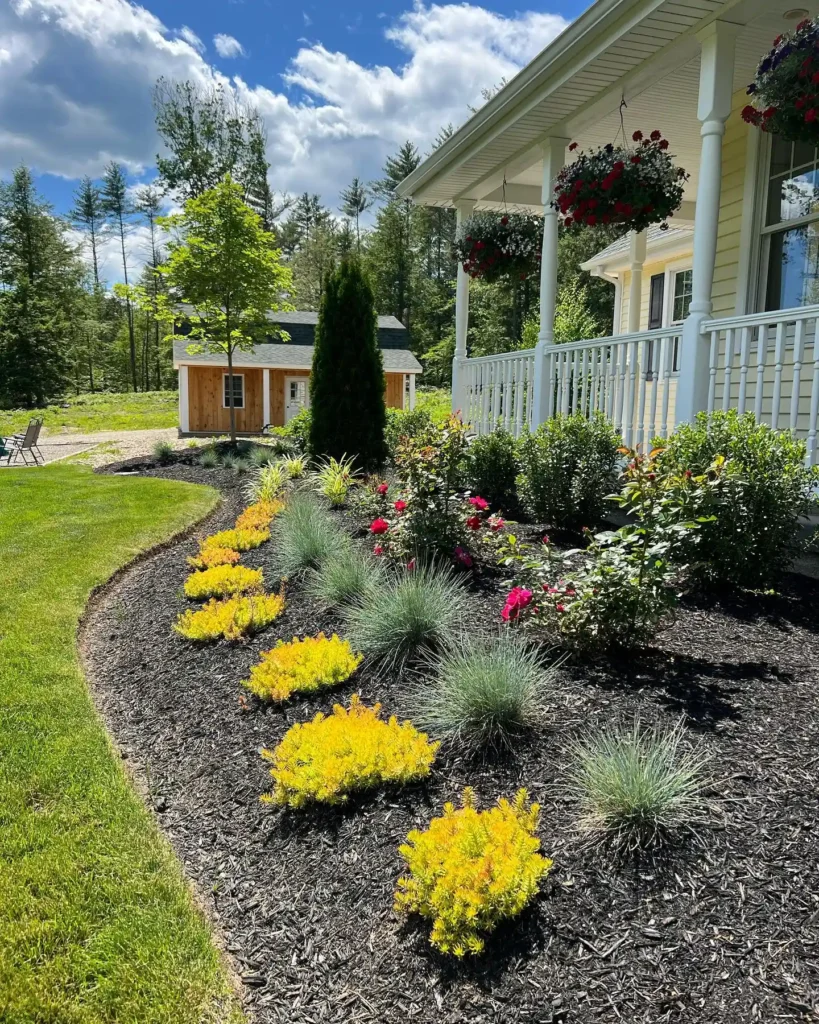 This design is simple but very effective. The curved edging frames the porch beautifully, and the shrubs are spaced just enough to look full without feeling crowded. The pop of red flowers adds color without overwhelming the space.