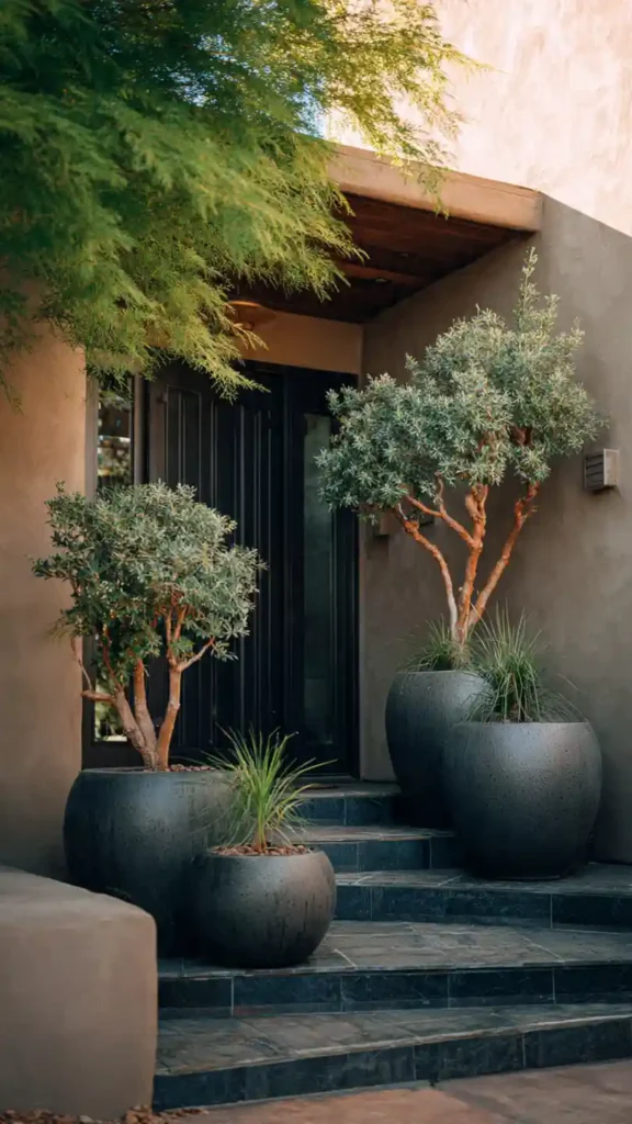- Use large matching planters near entry points
