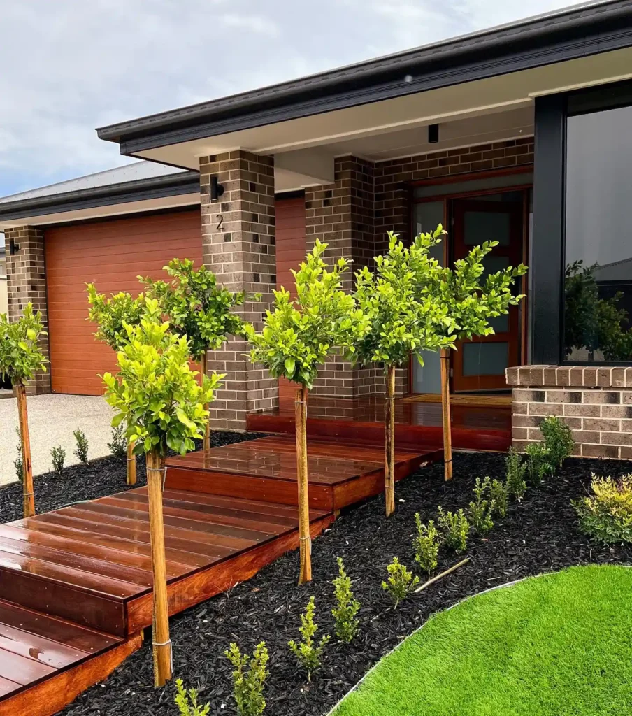 This is clean, simple, and very intentional. The wooden pathway draws you straight to the entrance, while the evenly spaced small trees create symmetry on both sides. It feels modern but still warm because of the natural wood and greenery.