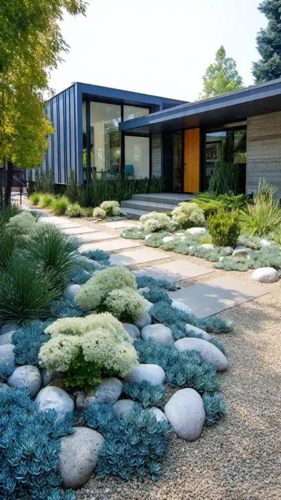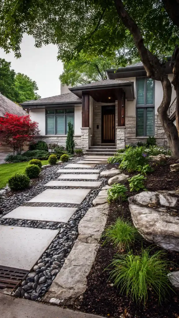 This design feels more modern and relaxed at the same time. The large stepping slabs with gravel in between create a clean path, while the rocks and plants on the side add texture. It’s less about symmetry and more about balance, which makes it feel natural and stylish.