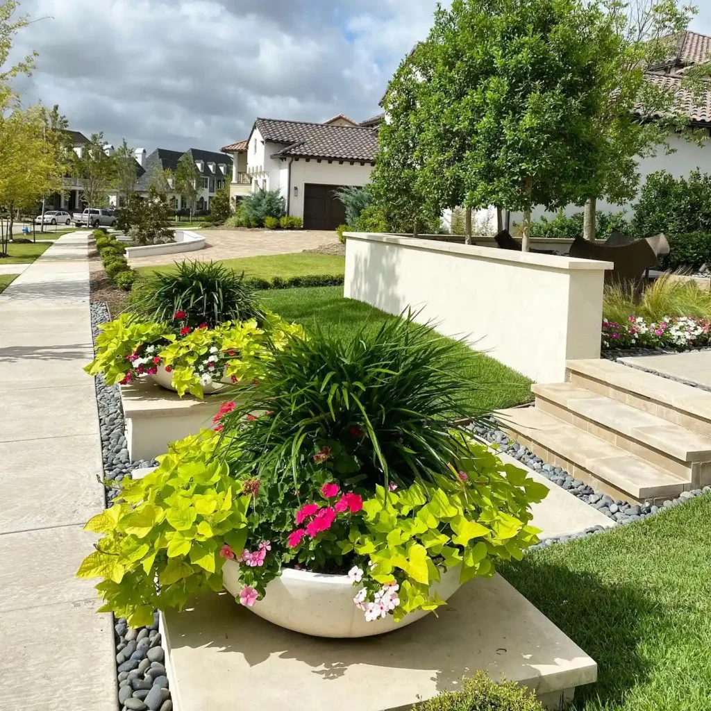 This front yard leans more toward a modern style with its raised concrete planter and clean layout. The layered greenery and trailing plants soften the hard edges, while the pops of pink flowers add just enough color. The mix of stone, concrete, and plants creates a balanced look that feels both structured and inviting.