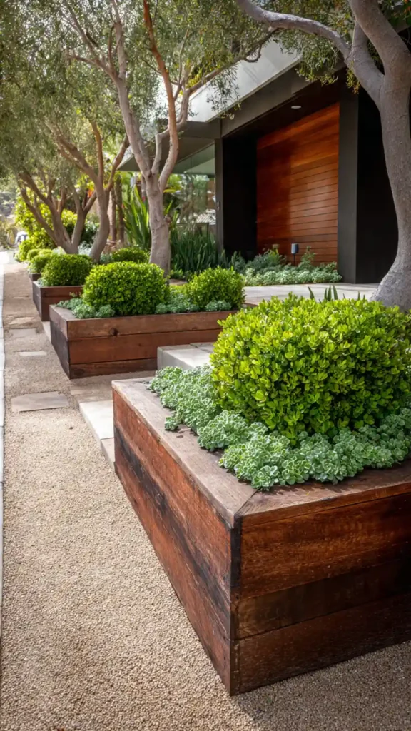 This layout feels very intentional and clean. The raised wooden beds create levels, which instantly makes the front yard look more designed. The mix of compact shrubs and trailing plants softens the wood, so it doesn’t feel too harsh.