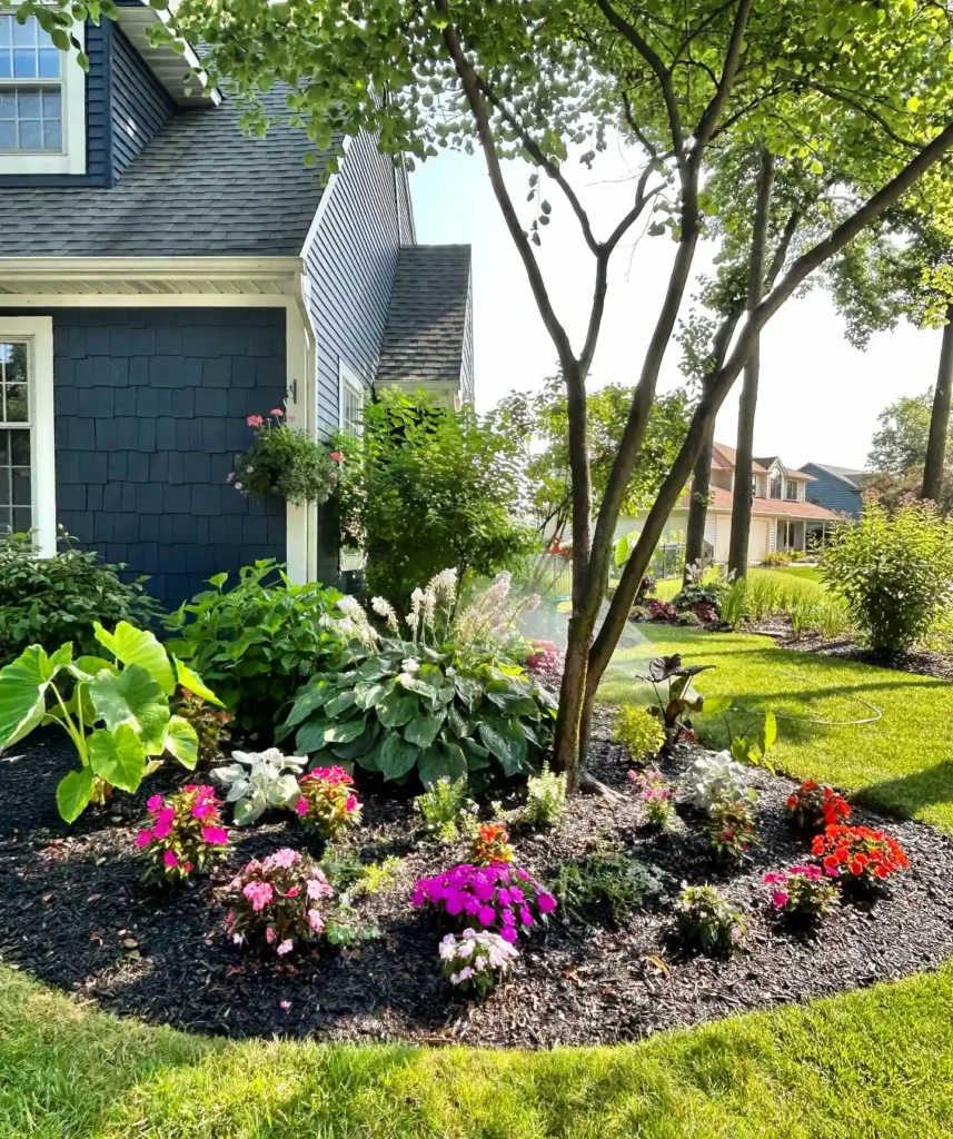 This design works because everything revolves around the tree. Instead of leaving that awkward empty space, it turns it into a full, lush focal point. The layered planting big leafy greens, mid-size flowering plants, and low border flowers makes the yard feel alive and balanced.