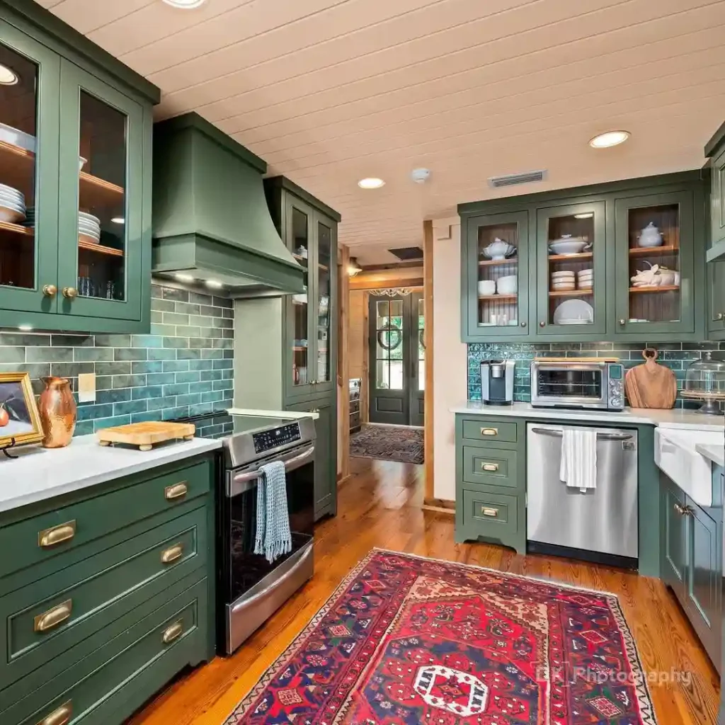 Rich green cabinets pair exquisitely with wood accents and warm lighting in this cozy kitchen design. The textured teal backsplash and red vintage-style rug create a layered, timeless look with depth and character.