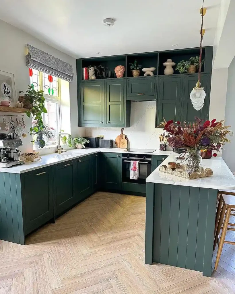 Why it works: The elegant herringbone wood floors and fresh flowers by the window create a perfect tension between polished design and lived-in comfort. This space proves that darker green cabinets can feel both stylish and serene—creating an atmosphere that’s equally suited for dinner preparation or quiet relaxation.