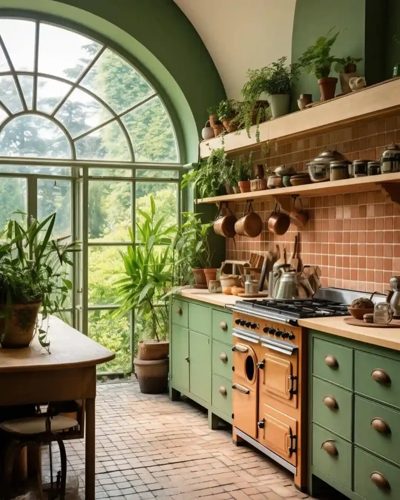 Standout feature: The large arched window serves as both a design element and functional feature, dissolving boundaries between the indoor kitchen and the lush green landscape outside. This connection to nature is further enhanced by potted plants and displayed copper cookware.