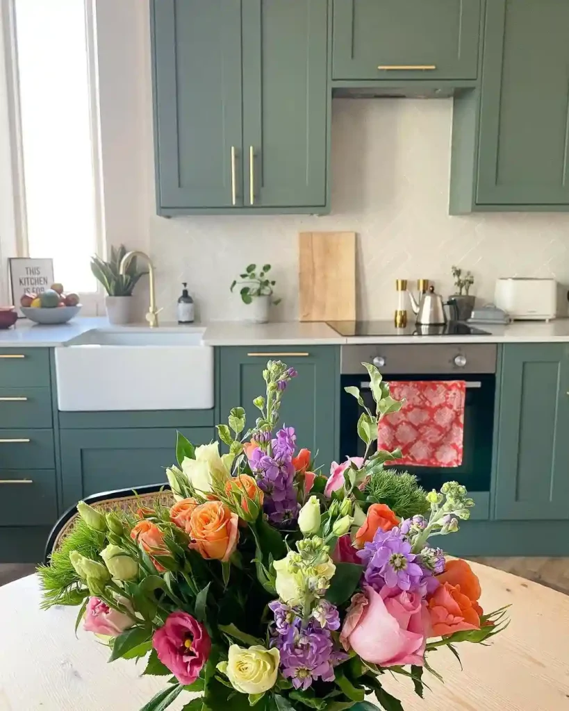 1. Fresh & Floral Charm in a Green Kitchen