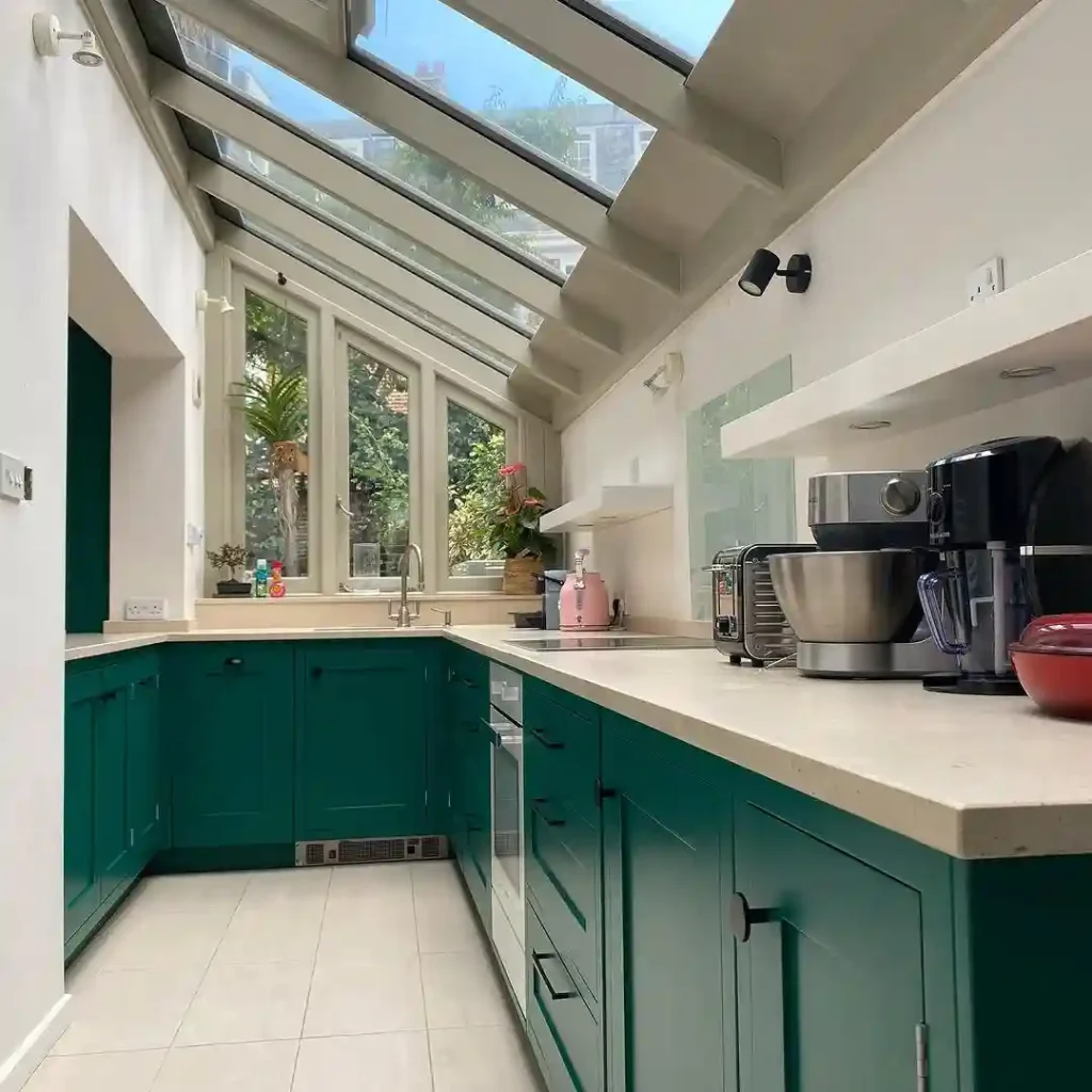 Flooded with natural light from dramatically angled glass ceiling panels, this kitchen truly feels like an extension of the garden. Deep green cabinets introduce rich, earthy tones, while light beige countertops keep the overall effect grounded and practical.