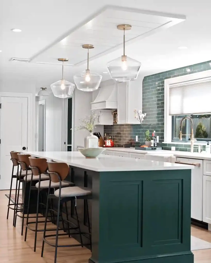 This kitchen introduces an unexpected twist with a deep green island set against bright white perimeter cabinetry. The glossy green subway tile backsplash ties these elements together beautifully, adding reflective quality and textural depth to the overall design.