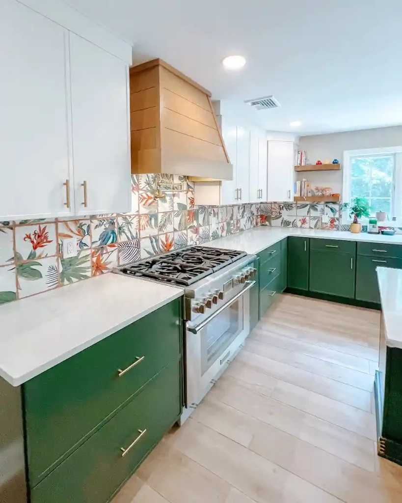 This kitchen makes a confident statement with leafy green cabinets complemented by a vibrant tile backsplash featuring botanical and jungle-inspired patterns. White upper cabinets and countertops provide visual balance, while the light wood flooring adds necessary warmth.