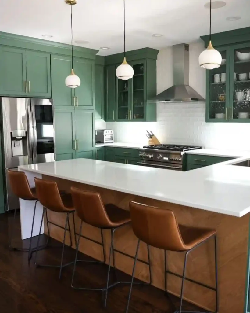 Functionality: This smart, stylish kitchen layout accommodates both social gatherings and efficient weekday morning routines, proving that green cabinets can feel equally appropriate in contemporary and traditional settings.