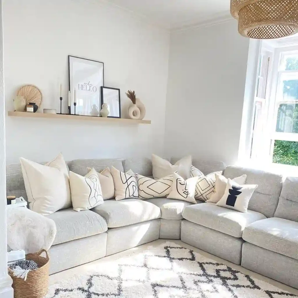This light grey sectional feels fresh and airy in a sunlit corner, styled with oversized cream and abstract-line cushions for a modern twist. A slim floating shelf above displays minimalist decor and framed prints, adding height without crowding the wall. The geometric rug ties the palette together, while the woven pendant light introduces a touch of natural texture. Perfect for creating a relaxed, Scandi-inspired grey sofa living room.