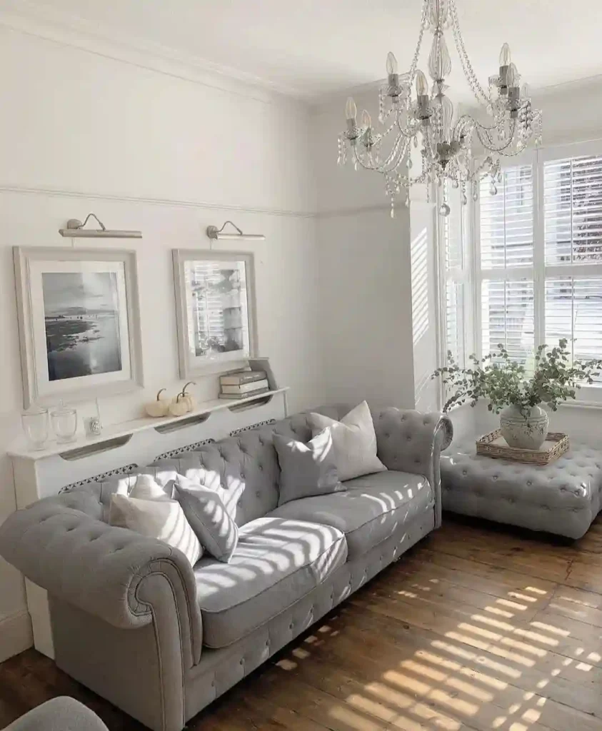 A tufted grey Chesterfield sofa sets the tone for timeless elegance here. The white walls and high ceilings keep the space airy, while the crystal chandelier and framed black-and-white artwork add vintage charm. Natural wood floors bring warmth, and a matching tufted ottoman doubles as a coffee table. This pairing shows how a grey sofa can bridge classic and contemporary styles with ease.