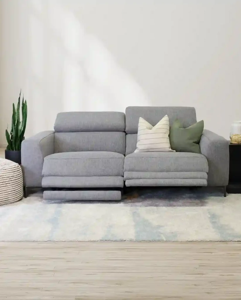 This sleek grey recliner sofa blends comfort with function. Its adjustable headrests and deep seats make it perfect for lounging, while the soft striped cushion and pale green accent pillow bring subtle colour. The textured area rug adds softness underfoot, and a black side table keeps the look streamlined.