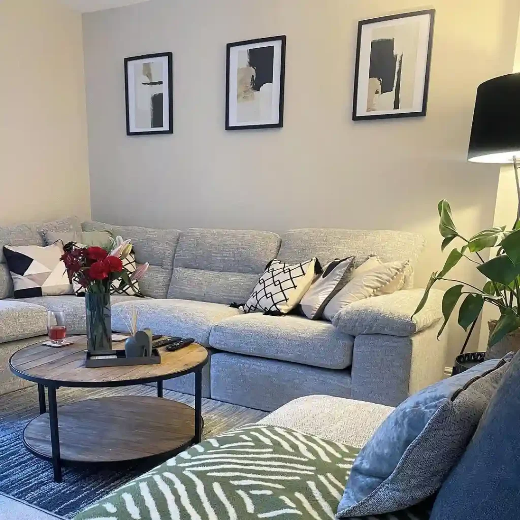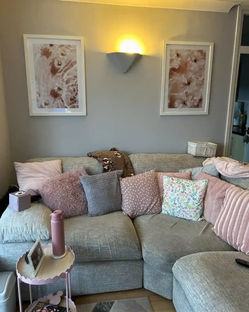 A light grey corner sofa is made extra cosy with a mix of blush pink, patterned, and textured cushions. The warm wall light and floral prints above the sofa add a touch of romance, while the small scalloped side table ties into the feminine accents. This look is perfect for creating a soft, relaxed atmosphere in a grey sofa living room.