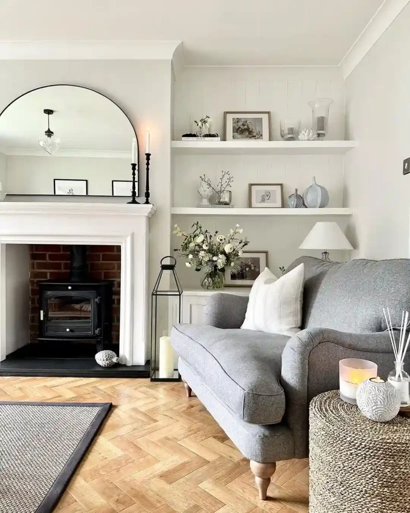 This space blends cottage charm with modern comfort. The compact grey sofa features soft curves and turned wooden legs, sitting perfectly in front of built-in shelves styled with simple ceramics and framed prints. A black wood-burning stove adds a cosy focal point, while the herringbone wood flooring warms the cool tones. The round mirror above the fireplace subtly reflects light, creating an airy yet snug atmosphere.