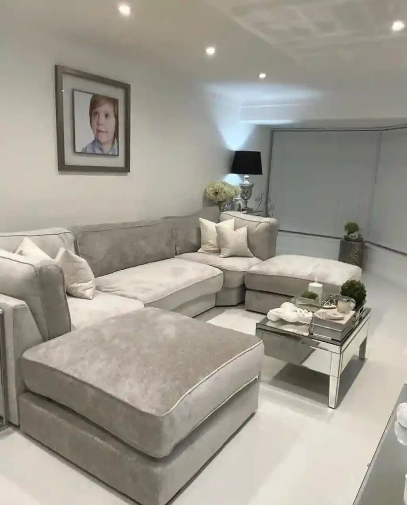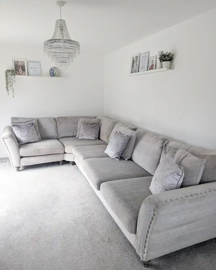 This space leans into glamour with a shimmering grey sectional, patterned cushions, and a high-shine mirrored wall frame. The chandelier and matching silver floor lamp bring sparkle, while the white coffee table and fluffy grey rug keep things light. Silver photo frames on the wall personalise the room, making it feel luxurious yet homey. A grey sofa like this works beautifully with layered textures and metallic accents for a sophisticated look.