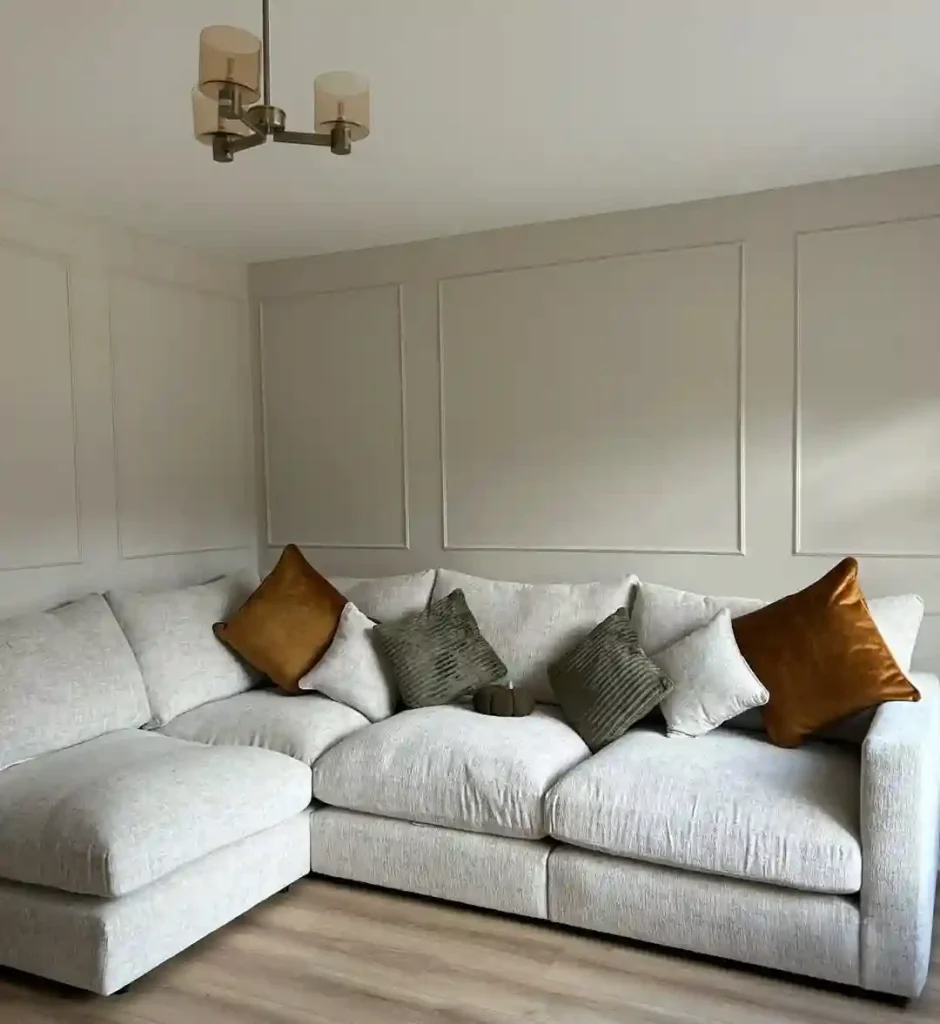 In this space, a light grey corner sofa is brought to life with deep bronze and olive velvet cushions. The tonal wall panelling adds depth without overpowering the room, and the light wood flooring ties it all together.