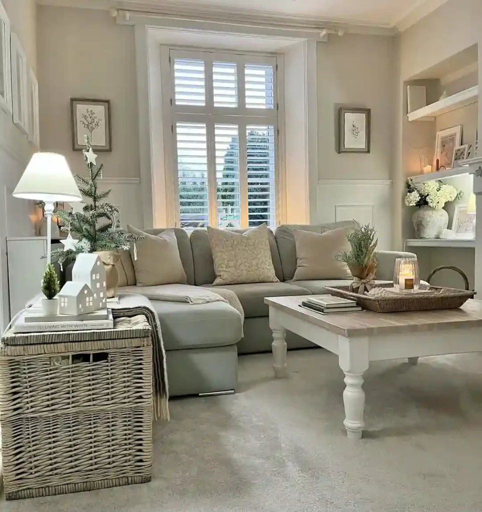 This soft-toned grey sectional sits beneath a large window with plantation shutters, flooding the space with light. Neutral cushions, a rustic coffee table, and woven storage basket bring texture, while a few festive touches keep it feeling fresh and inviting.