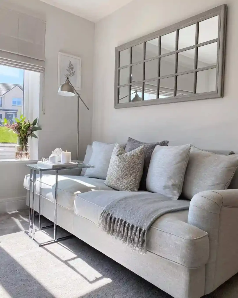This bright corner feels instantly inviting thanks to the soft grey sofa layered with plush cushions and a fringed throw. A large window floods the room with natural light, while the grid-style mirror above the sofa subtly enhances the sense of space. The slim chrome side table adds a touch of modern polish without crowding the layout. Paired with neutral walls and a delicate floral print, this look proves how a grey sofa can create a calm yet stylish living space.