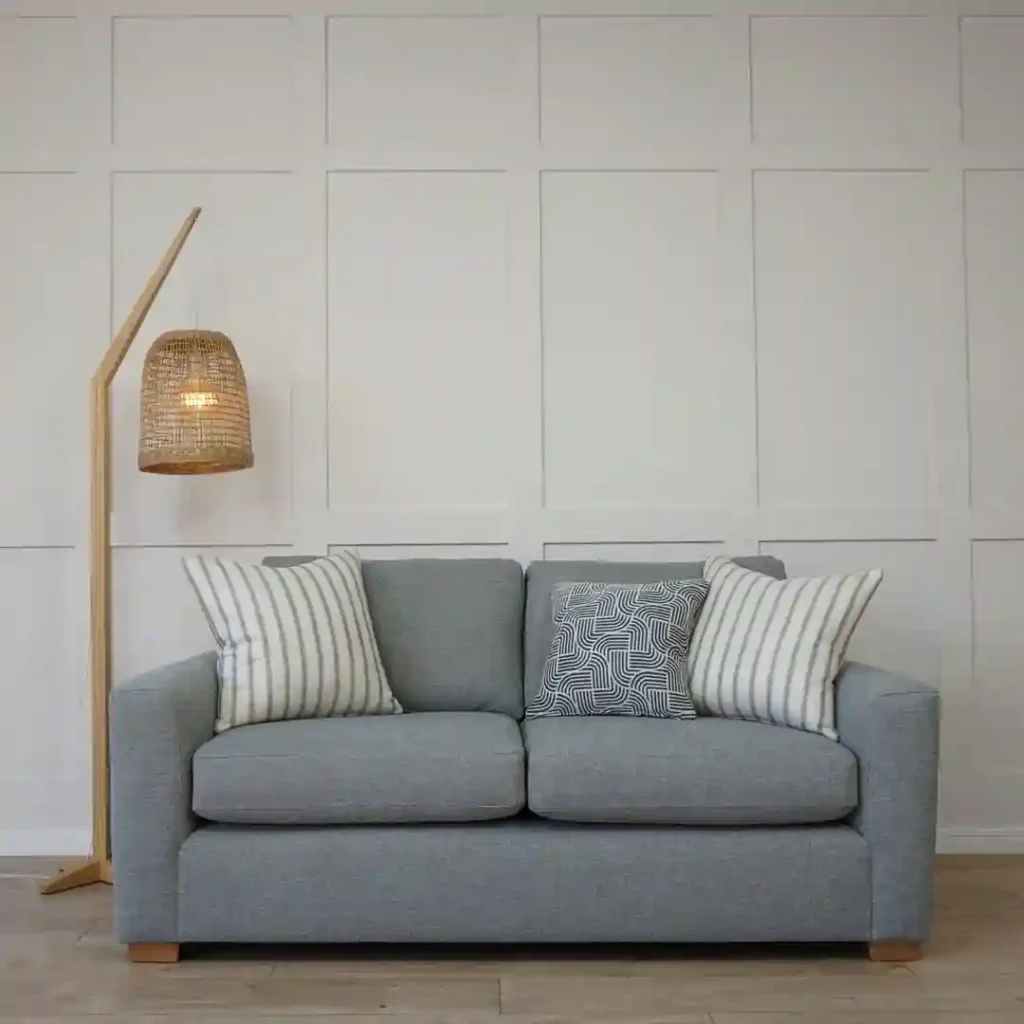 A simple grey loveseat takes centre stage here, styled with striped and geometric cushions for subtle pattern. The clean lines of the sofa complement the paneled white wall, while the woven floor lamp adds texture and warmth. Ideal for a compact space that still wants impact.