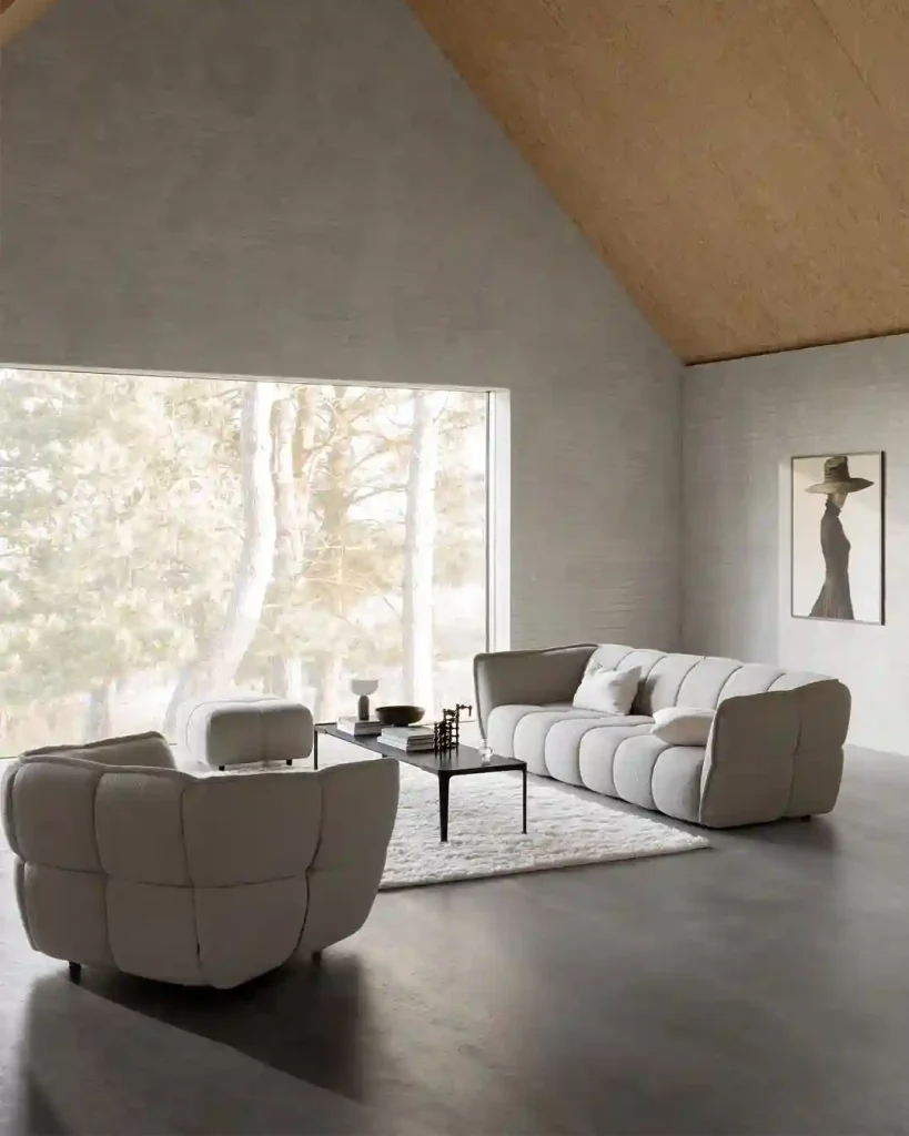 In this modern setting, a low-profile grey sofa and matching armchair sit against expansive windows and a vaulted ceiling. The space is pared back to essentials—a slim black coffee table, a simple white rug, and one large piece of wall art—letting the sofa’s soft, pillowy shape take centre stage. This style is ideal for those who love a clean, uncluttered aesthetic.