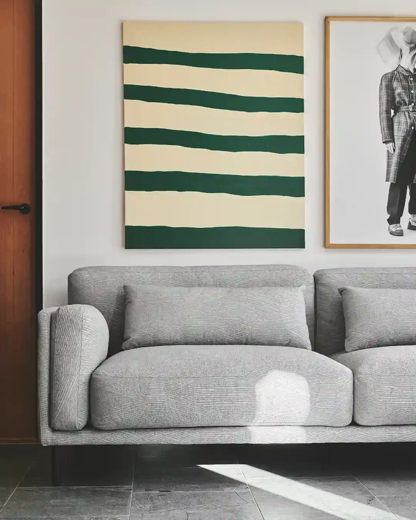 This clean-lined grey sofa sits beneath bold, oversized wall art, creating a gallery-like feel. The sleek arms and tailored cushions give it a modern edge, while the neutral floor tiles balance the contemporary aesthetic.