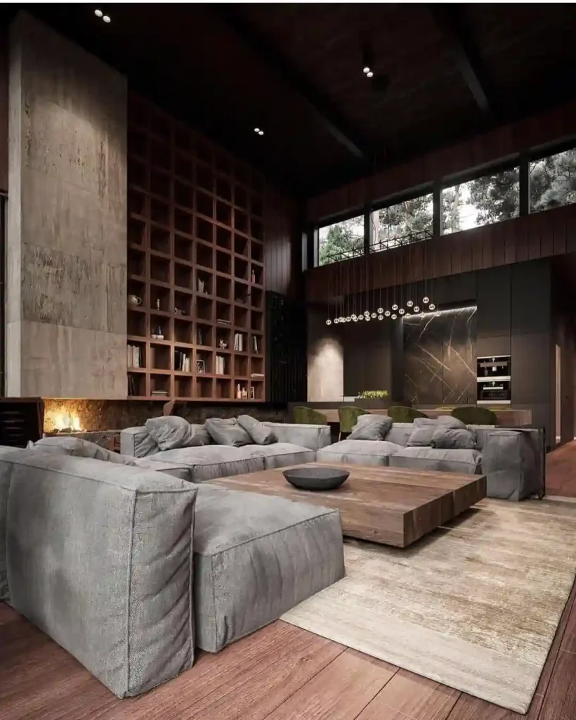 Low, oversized grey sofas surround a chunky wooden coffee table in this striking modern rustic space. The dark wood floors and walls create a moody backdrop, while the open shelving wall adds texture. Soft lighting and the earthy palette make the space feel warm and grounded despite its contemporary lines.