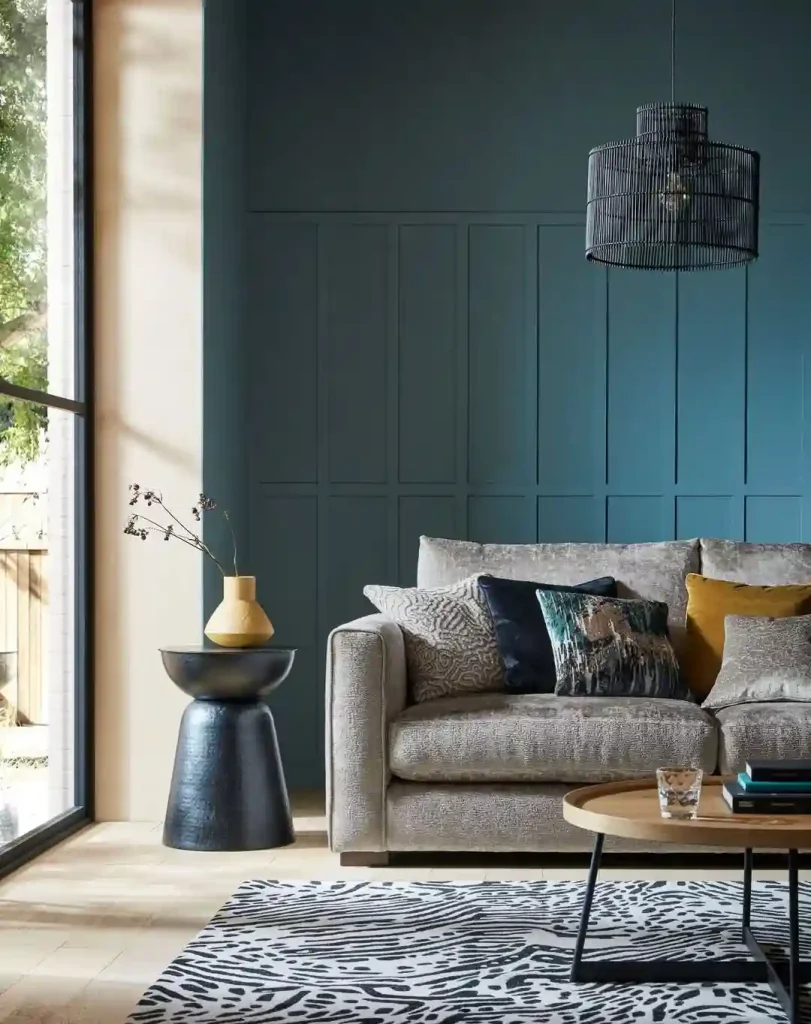 A deep blue feature wall creates a rich backdrop for this textured grey sofa. Plush cushions in mustard, navy, and metallic tones add contrast, while a patterned monochrome rug anchors the look. The sleek black side table and woven pendant light bring a touch of natural texture, making this space feel both modern and layered.