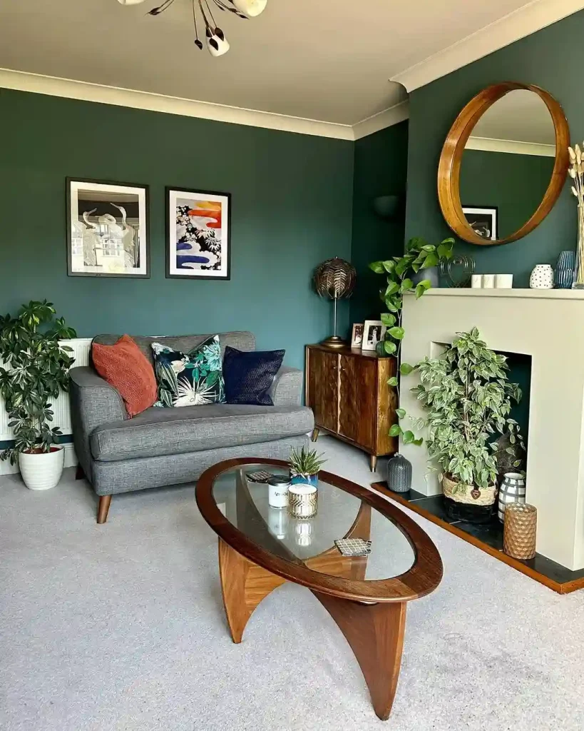 Deep green walls give this room a cosy, cocoon-like feel, making the mid-tone grey sofa pop beautifully. Vibrant cushions in burnt orange, emerald, and navy add personality, while plants bring a fresh, organic touch. The oval wood-and-glass coffee table and round wall mirror introduce warmth and shape contrast. This style is proof that a grey sofa doesn’t have to live in a neutral space—it can anchor bold colour schemes too.