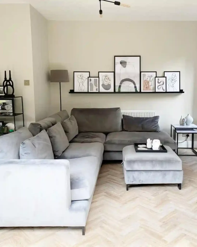 Here, a smooth grey sectional is styled with minimal cushions and paired with a simple ottoman. Above, a slim black shelf displays framed artwork in various sizes, creating a casual gallery wall. The light wood herringbone flooring keeps the palette soft and neutral.
