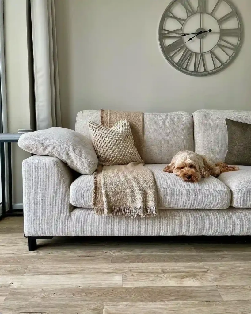 A beige-grey sofa sits against a taupe wall, dressed with knitted cushions and a textured throw. The oversized wall clock and warm wood floors keep the space grounded, while a relaxed sleeping pup proves just how comfortable it is.