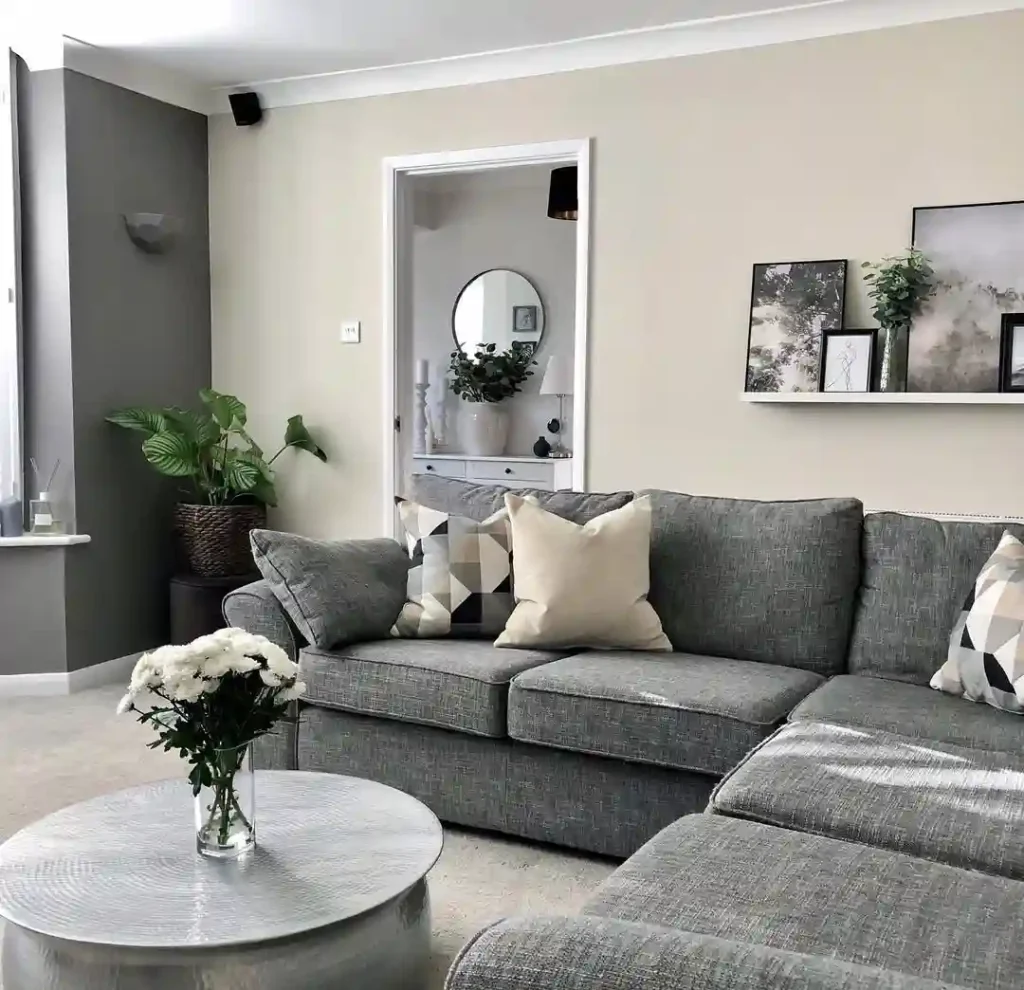 This living room pairs a deep grey sectional with monochrome geometric cushions for a modern twist. The silver coffee table and simple floral arrangement add elegance, while soft beige walls prevent the look from feeling too stark. It’s a clean, balanced design perfect for a contemporary home.