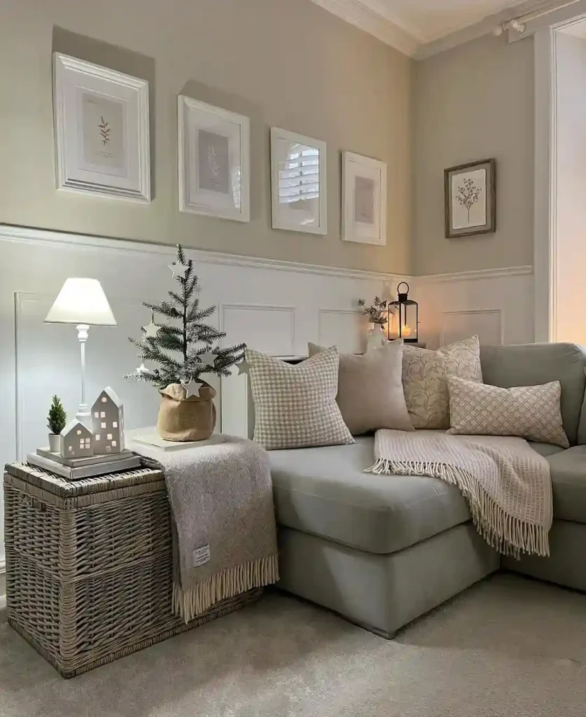 This inviting nook features a soft grey sectional paired with warm beige and patterned cushions. The panelled wall, layered throws, and soft lighting create a snug atmosphere perfect for evenings in. A small tabletop tree and candle lanterns add a seasonal touch, making it feel extra homely.