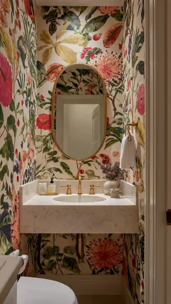 A bold wallpaper can instantly turn a small half bathroom into a stylish focal point. Because powder rooms are compact, they are a great place to experiment with patterns that might feel overwhelming in larger spaces. Floral prints, botanical designs, or geometric patterns can add personality and color to the walls. Pair the wallpaper with simple fixtures and a clean vanity so the pattern remains the star of the room. Adding brass or gold lighting can also elevate the look and make the space feel more refined.