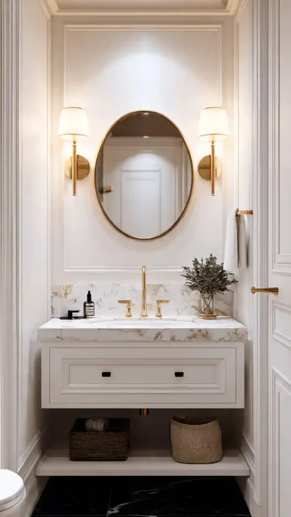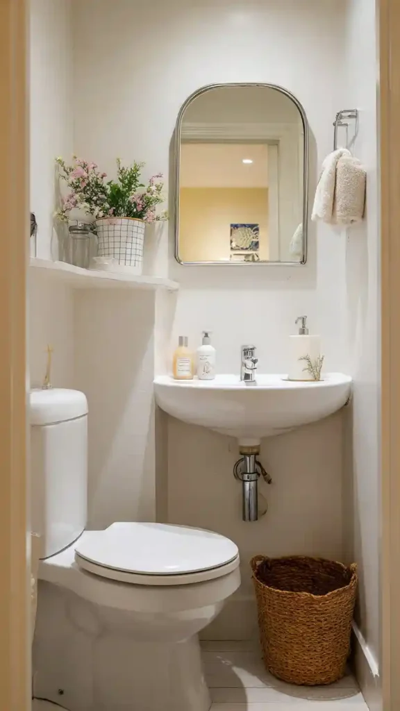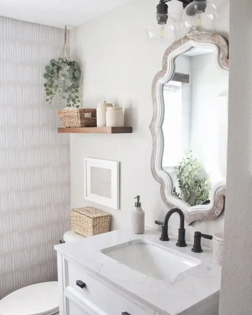 A decorative mirror instantly gives this bathroom character. The soft neutral palette makes the room feel calm and airy, while woven baskets and simple shelves add natural texture. A hanging plant introduces greenery, helping the space feel fresh and inviting. This design works especially well for small powder rooms that need a light and open feel.