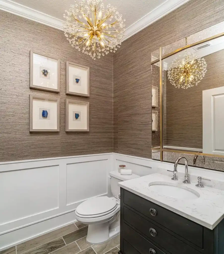 Lighting can completely transform a small bathroom, and this design proves it. The gold chandelier acts as a focal point and brings a sense of elegance to the space. Textured wallpaper adds depth while classic white wall paneling keeps the room feeling balanced. The marble countertop and dark vanity create a sophisticated contrast.