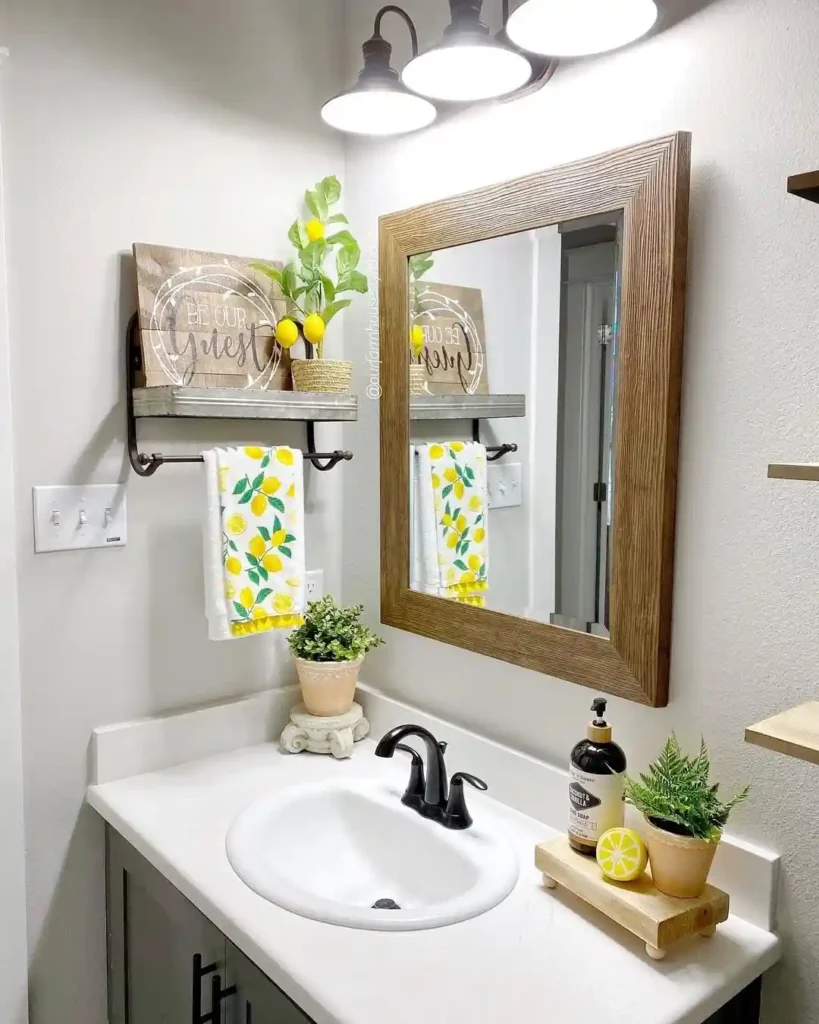 Bright accents make this powder room feel cheerful and inviting. Lemon-themed decor on the shelf and countertop adds color while staying simple. A wooden mirror frame warms up the neutral walls, and small plants help bring life into the room. Even small decorative touches like patterned towels help the space feel styled and welcoming.