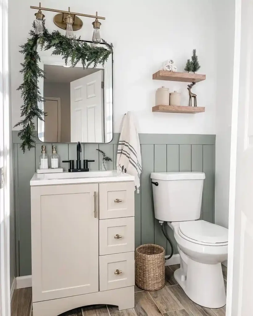 This half bathroom uses deep green wainscoting to create a rich and cozy look while the upper walls stay bright white. The contrast helps the small space feel balanced instead of dark. A light wood vanity softens the bold wall color, while brass fixtures and a curved mirror add warmth and elegance. A small floating shelf holds simple decor like glass bottles and flowers, which keeps the room styled without making it feel crowded.