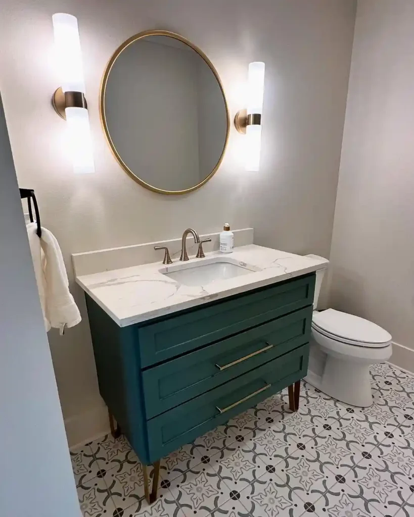 A teal vanity instantly adds color and personality to this half bathroom. The patterned tile floor complements the vanity while keeping the design interesting. A round mirror with vertical wall lights creates balanced lighting around the sink area. The marble countertop keeps the space feeling bright and polished.
