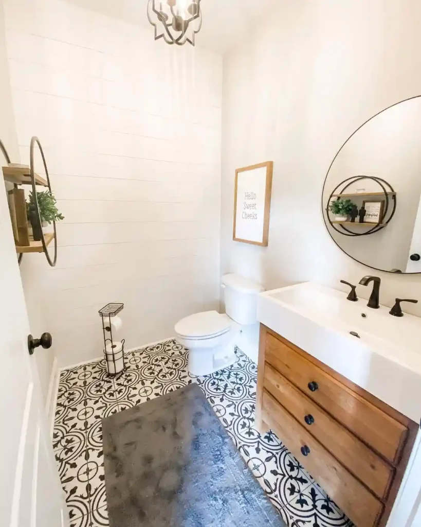 In this design, the patterned floor tiles become the focal point of the entire room. The black and white tile pattern adds visual interest while the rest of the space stays simple and bright. A wood vanity introduces warmth, and a round mirror with a built-in shelf adds both style and function. The clean white walls help balance the bold floor pattern so the room still feels open.